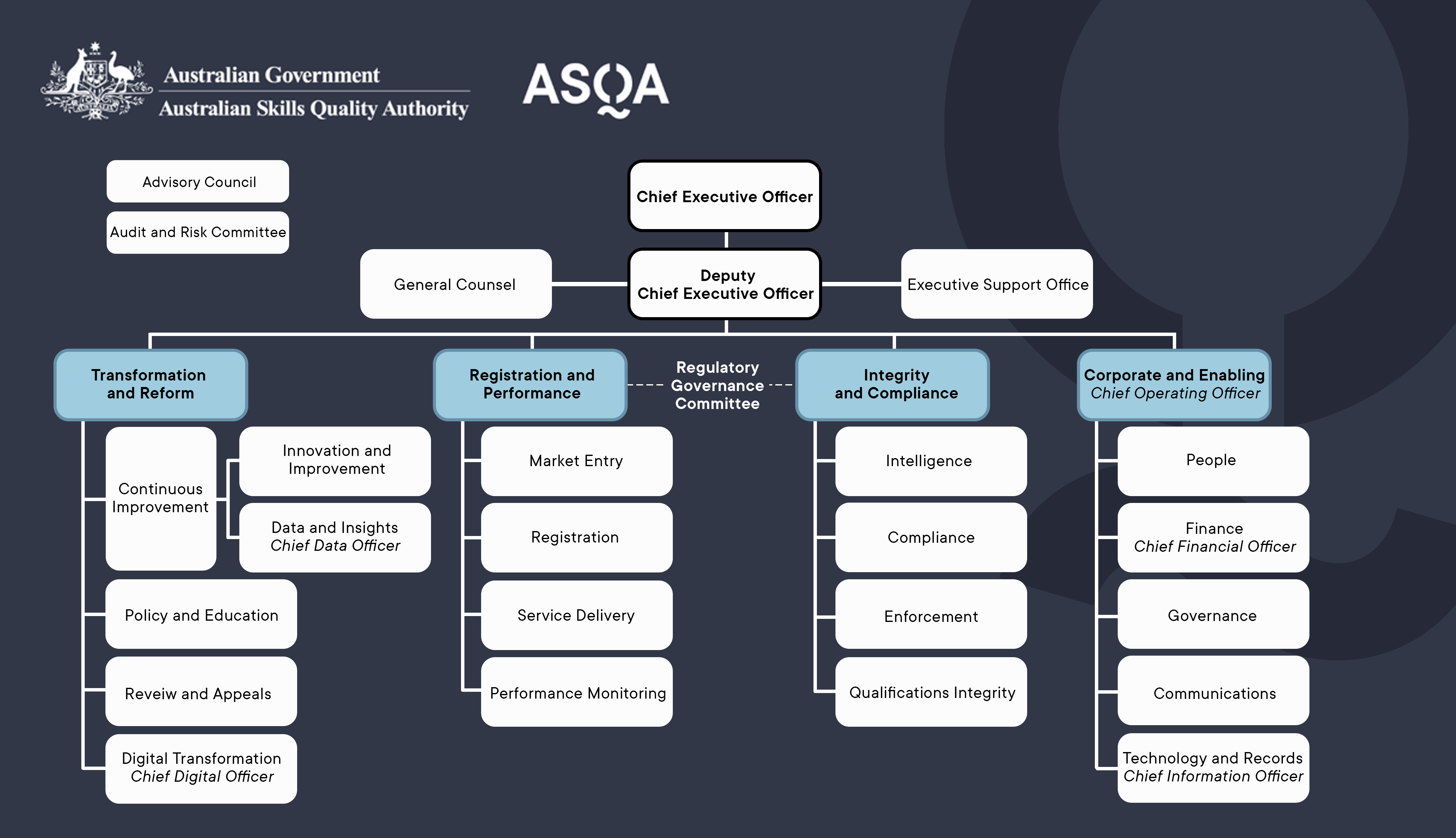 Below is ASQA’s national organisation structure, as at 1 October 2025.